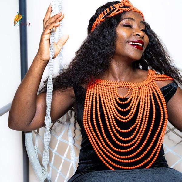 Il s'agit d'un ensemble de bijoux traditionnels africains, souvent associés aux cultures du Nigeria, en particulier les peuples Yoruba ou Edo. L'ensemble est composé de plusieurs pièces, toutes confectionnées à partir de perles de corail de couleur orange.